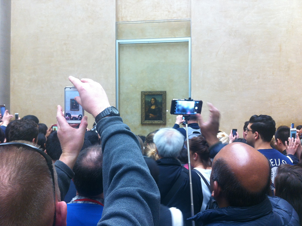 De wandeling naar de Mona Lisa is een soort “Kunststukken der Aarde”-parade, met gang na gang gevuld met verbluffend mooie beelden, schilderijen en relikwieën. Na wat leek op een eeuwigheid in dit culturele doolhof, kwam ik aan bij het heiligdom van de meest mysterieuze glimlach ter wereld. En zoals te verwachten was, had ik veel gezelschap.