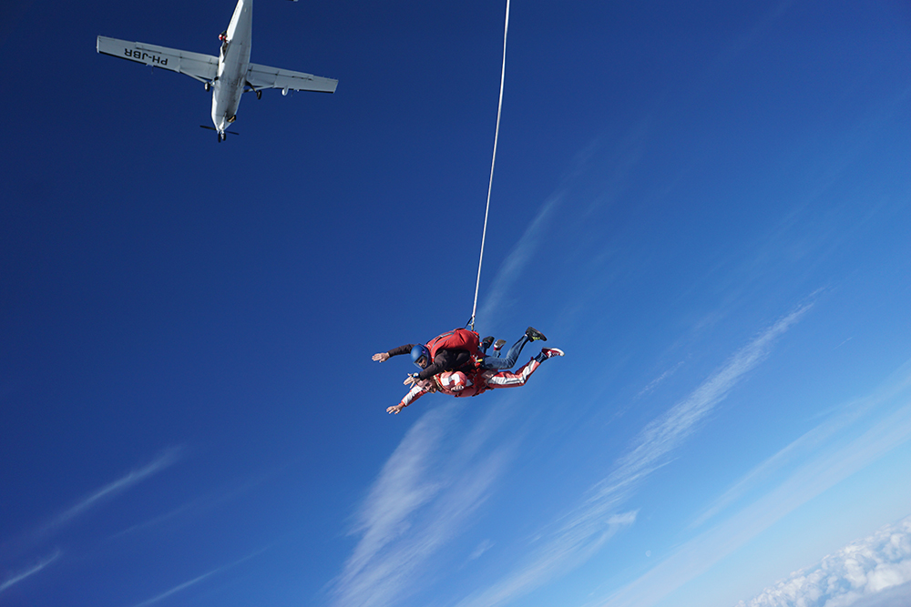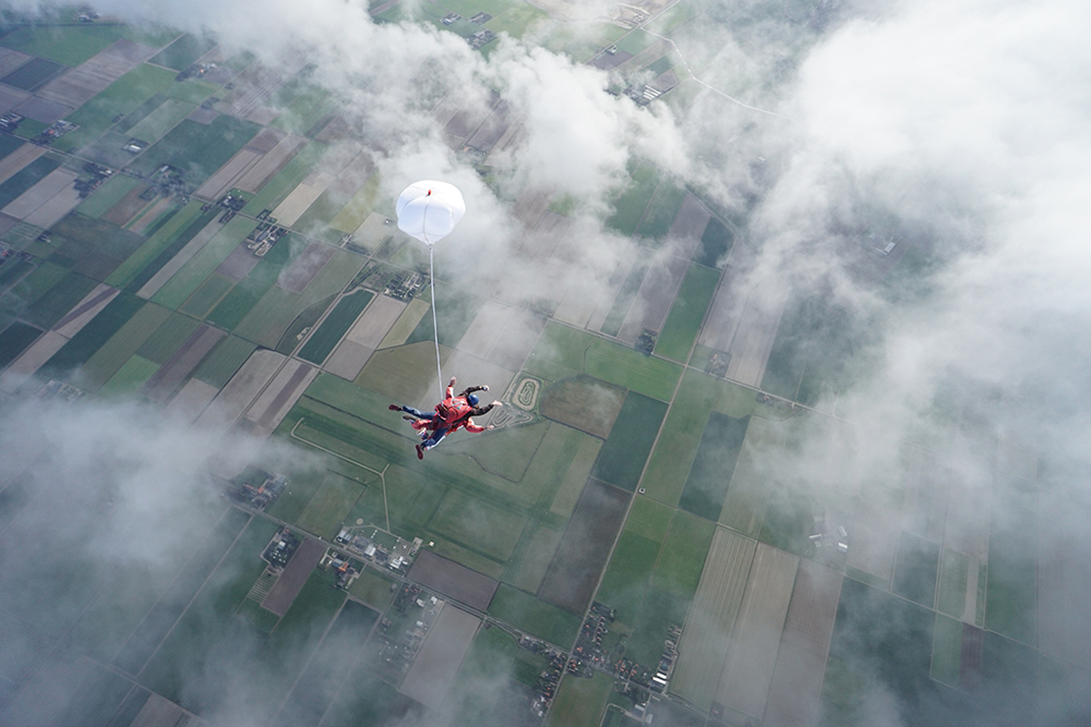 Het vliegtuig schokte tot leven en rolde over het grasveld. Terwijl we opstegen, waren de adembenemende uitzichten over de eilanden een welkome afleiding van de stijgende hartslag. Toen we 13.000 voet bereikten, schoof de deur open met een zucht van koude lucht. Een paar tellen later zat ik met mijn benen buitenboord, alsof ik zomaar van een zondagse picknick genoot. En toen, de countdown. 3…2…1… en voor ik het wist, schoot ik als een ongeleide raket door de deur. Terwijl Moeder Aarde me met een gemiddelde snelheid van 180 km/u naar zich toe trok, deed ik mijn best om de vrije val van een minuut te omarmen. De wind gaf me de natuurlijke facelift waar ik niet om gevraagd had en het gevoel van gewichtloosheid deed me vermoeden dat ik deel moest zijn van de cast van de nieuwste Scifi film.